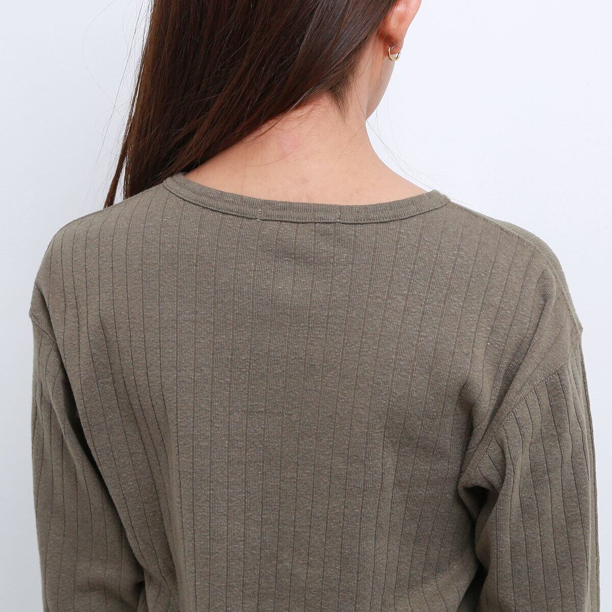 ムラ感のあるスラブ糸を針抜きで編み立てることで、ヴィンテージのような雰囲気に、軽い着心地の良さも兼ね備えています。