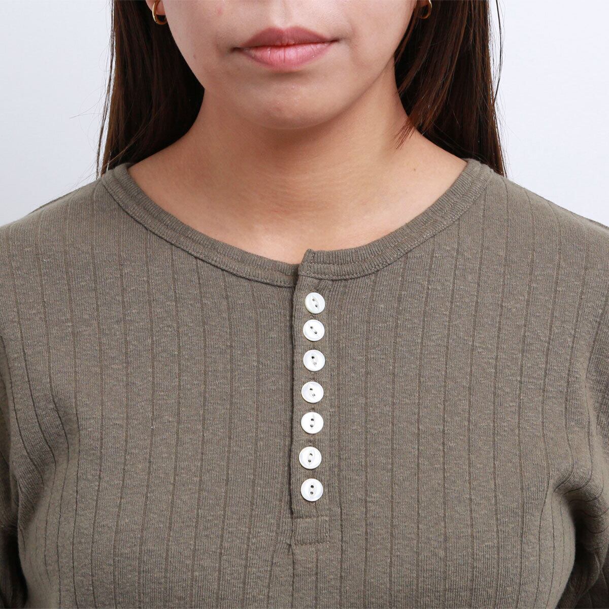 こだわりのスラブフライスを使用したヘンリーネックTシャツ。