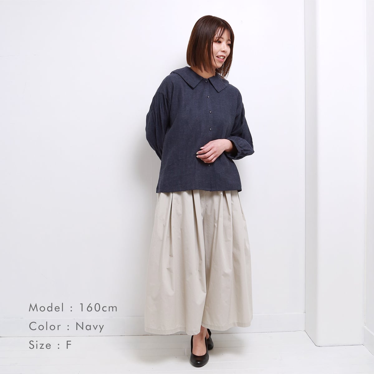 セーラカラーで後ろ姿は可愛らしく、前後差のある丈感と裾のサイドスリット、くるみボタンの統一感がシンプルなコーデのアクセントになります。