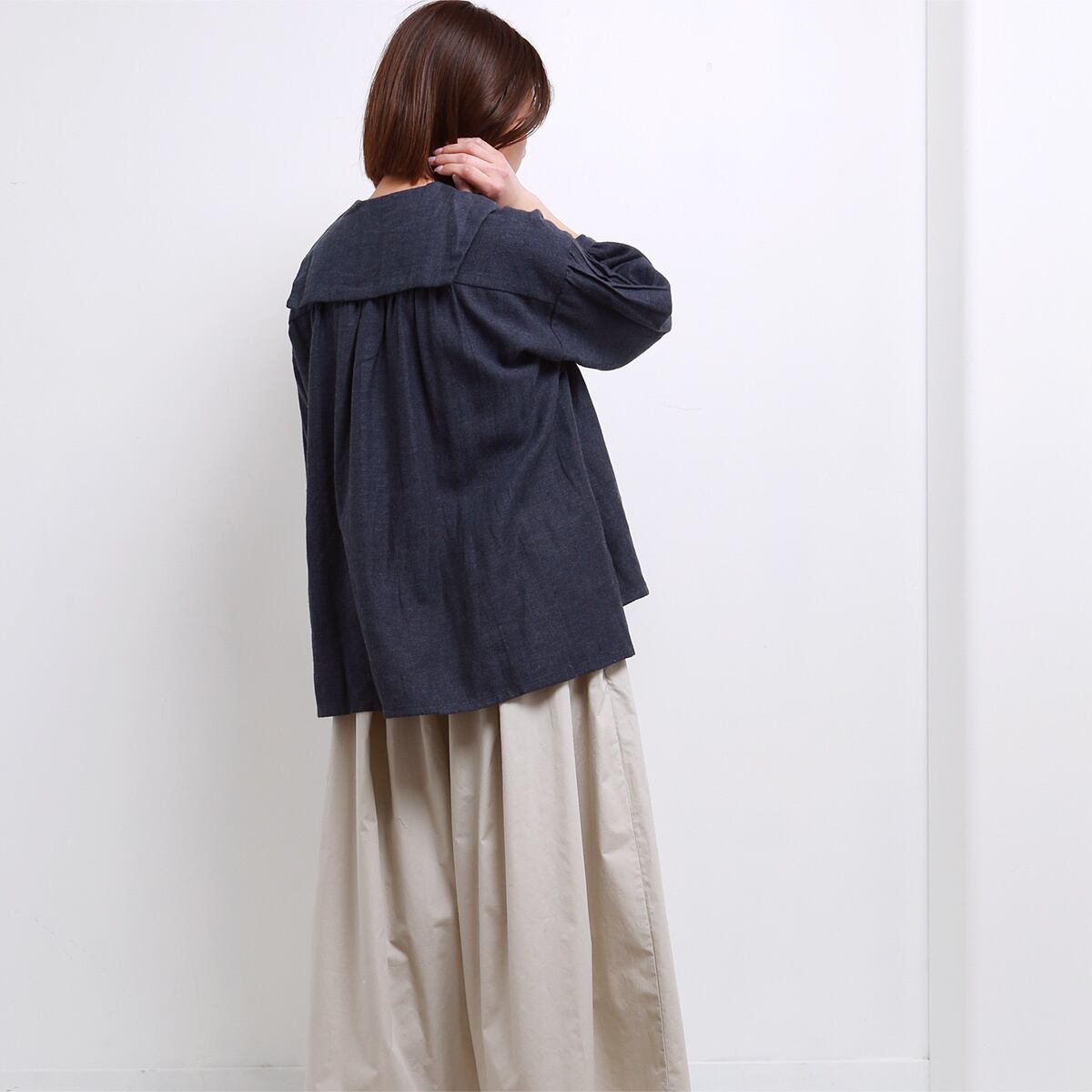 ナチュラルでさらりとしたやわらかな肌触りのリネンコットン素材のセーラーカラーブラウスです。