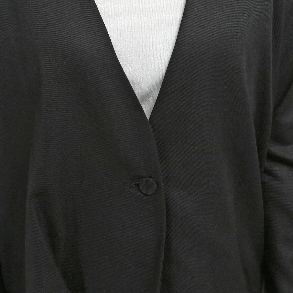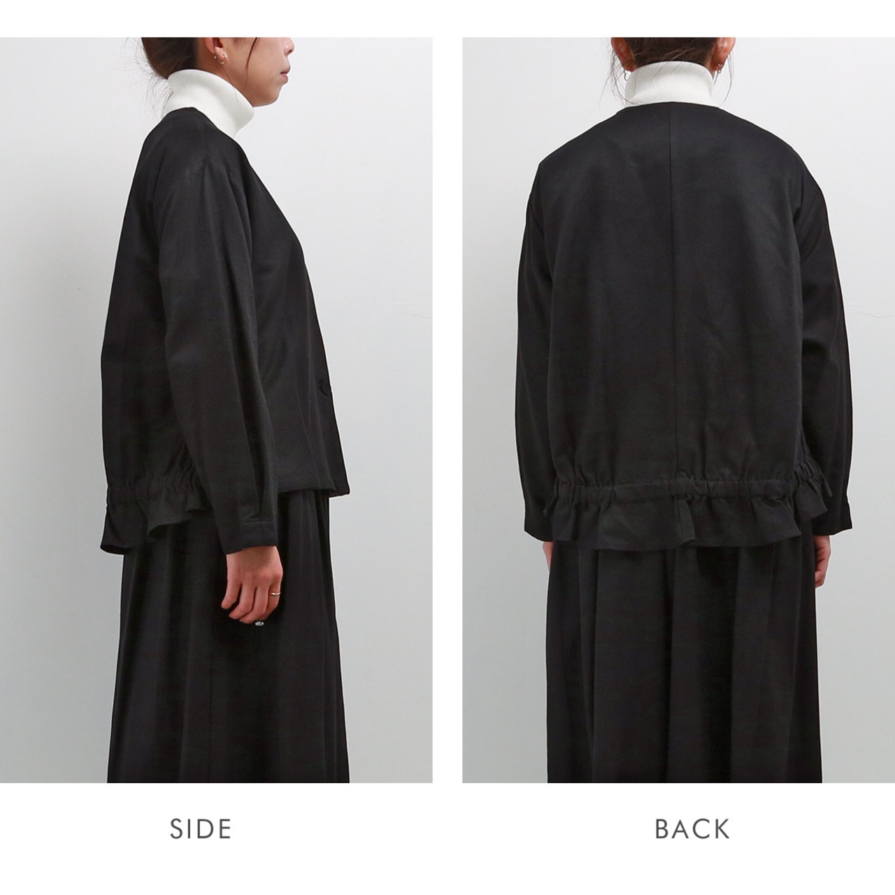 こちらのジャケットはフリル風のゴム入りギャザーで可愛らしさを残しつつも、フロント部分はVネック、ワンボタンになっているためスッキリとした印象を与えます。