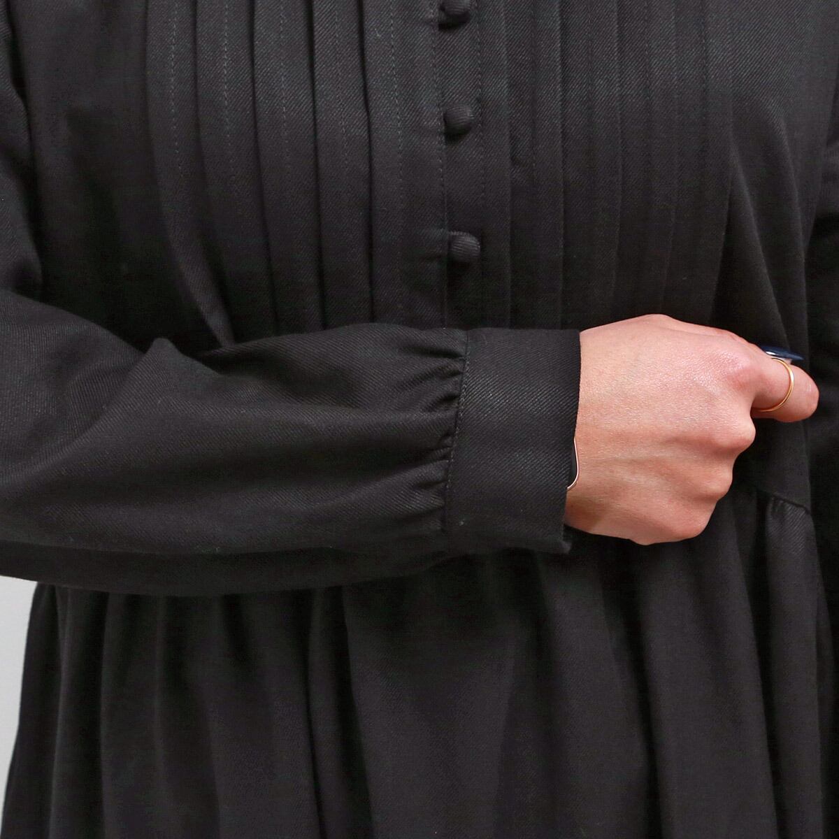 胸元のピンタック、ループ仕様のくるみボタンとウエスト切り替え部分に入っているギャザーによって上品で洗練された印象のあるワンピースです。