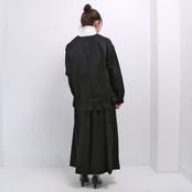 ウエスト部分はバックにゴムウエスト、フロントにタックが入っているのできちんとした印象を与え、コードで引き締めることでよりすっきりと見せることができます。
