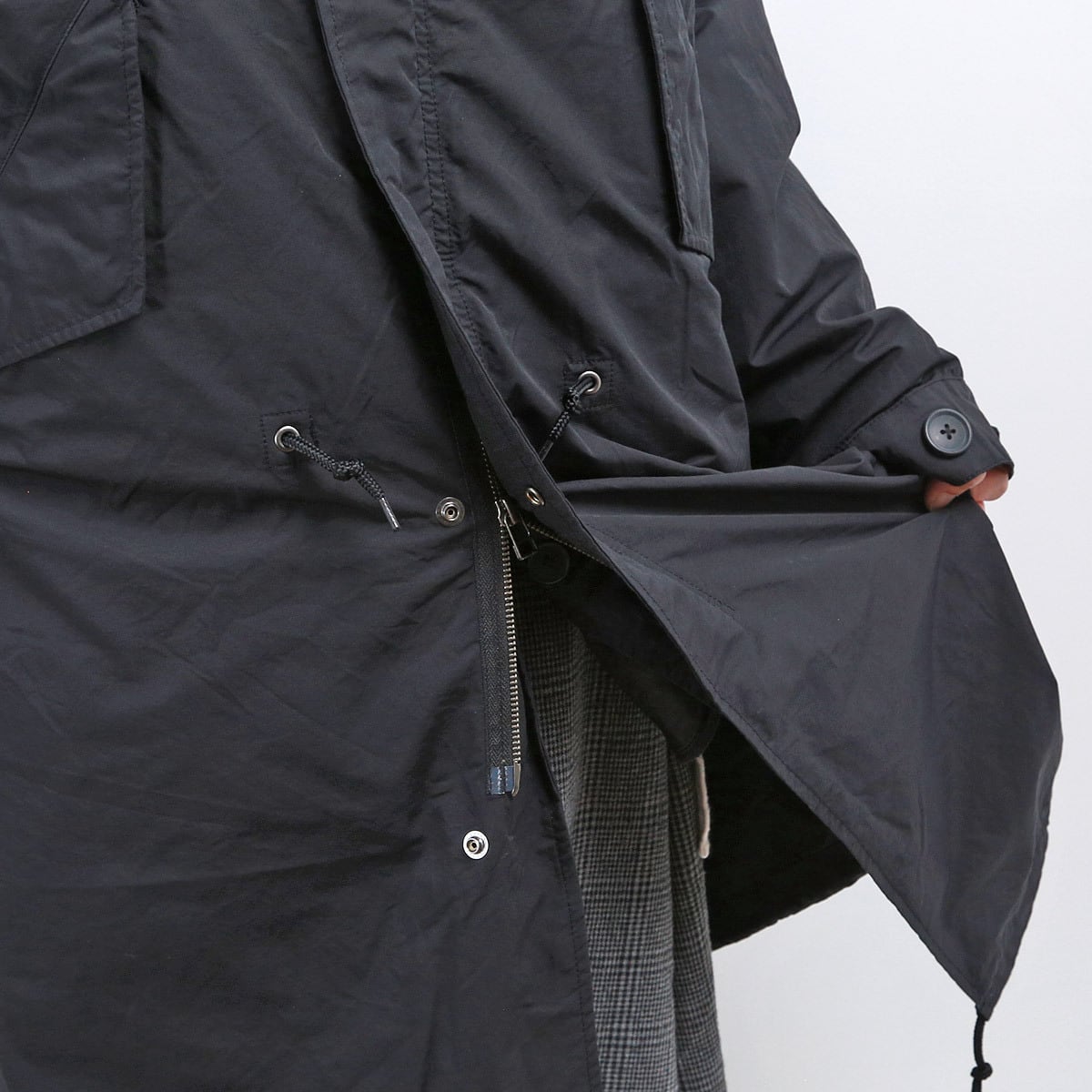 本物さながらの仕様ですが、ポリエステル・コットン・ナイロンの混紡素材を使用することで、軽量で着やすいモッズコートにアレンジ。